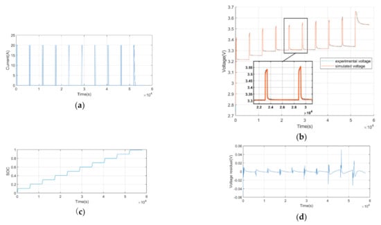 Results of parameter estimation: (a) Profile of input pulse charging current; (b) Comparison between experimental and simulated voltages output; (c) Change of SOC; (d) Voltage error between experimental and simulated voltages output.
