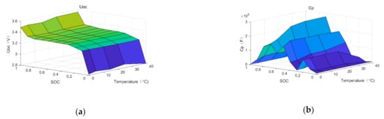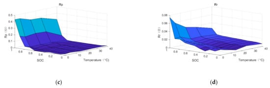 The four parameters in the equivalent circuit diagram, , , , , are all functions of SOC and temperature: