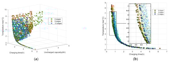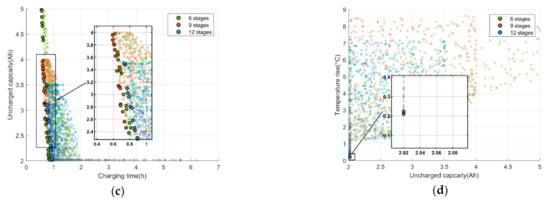 In Figure 6a, it can be clearly seen that the Pareto solution set consists of many three-dimensional scattered points, and there is no absolute optimal solution that enables the three optimization objectives to reach their minimum values simultaneously. To facilitate the analysis, the three-dimensional point cloud is projected onto the three coordinate planes, respectively, and the optimal Pareto solution in the two-dimensional plane is selected for further study. In Figure 6b,c, it can be seen that there are contradictions between the charging time and the maximum temperature increase, as well as the charging time and the uncharged capacity, which cannot be optimized at the same time. Meanwhile, in Figure 6d, both the uncharged capacity and the temperature increase can reach the optimal value at the same time. In Figure 6b, it can be seen that the temperature increase of stage 6 and stage 9 is similar, but are closer to the origin than stage 12, that is, the maximum temperature increase is lower during the same charging time. It can be seen from Figure 6c that the last stage may not be fully charged. Since the of stage 6 is larger, the maximum uncharged capacity is larger than the others, followed by stage 9, and the smallest is stage 12. At the same time, the Pareto solution of stage 9 is closer to the origin, which means closer to the optimal value, so more capacity is charged during the same charging time. In Figure 6d, there is little difference in capacity performance of the three stages with the best performance, and temperature performance of stages 9 and 12 is slightly better than that of stage 6. Above all, the charging performance of stage 9 and stage 12 is better than that of stage 6, but the charging performance of stage 12 is not significantly improved compared with that of stage 9. At the same time, too many segmentations of charging stages will increase the complexity of calculation and the loss of charging equipment. Therefore, the number of charging segments in this paper is set to nine.