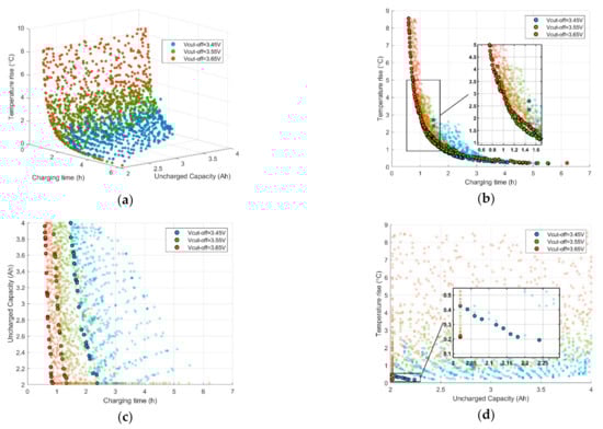 Figure 7a shows a scatter cloud of Pareto sets of the three optimization objectives. It can be seen that the temperature increase distribution of 3.65 V charging cut-off voltage is higher, and its Pareto set can provide a shorter charging time. This can be seen more clearly in Figure 7b. The temperature increase of the corresponding Pareto sets of the three cut-off voltages during the same charging time is almost the same. With increasing cut-off voltage, the shortest charging time can be further decreased, because higher cut-off voltage can provide greater charging current. It can be seen from Figure 7c that the Pareto set of 3.65 V cut-off voltage is closer to the origin than that of 3.55 V and 3.45 V, and the charging time is significantly shortened under the same uncharged capacity. In Figure 7d, the cut-off voltages of 3.65 V and 3.55 V are similar in capacity and temperature increase, and much better than 3.45 V. Based on the above analysis, this paper selects the 3.65 V charging cut-off voltage recommended by the battery manufacturer.