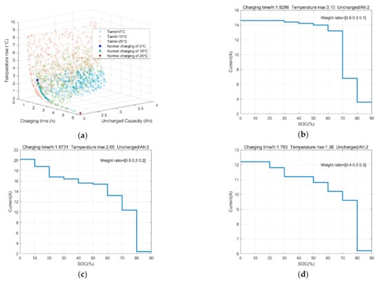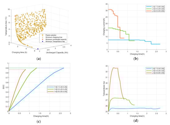 Figure 8a shows the overall Pareto solution sets of nine-stage charging strategies. In the daily use of EVs, according to the users’ different needs, an optimal solution under the specific requirements can be dertermined. To reflect the specific requirements in the selection of Pareto solution, this paper uses the method of weight metric factor. Since the charging time is an objective that users usually pay more attention to, the weight factor of charging time is set from 0.1 to 1 to study the effect, and the interval is 0.1. The weight factors of uncharged capacity and temperature increase are set to be equal, and can be obtained using Equation (34).