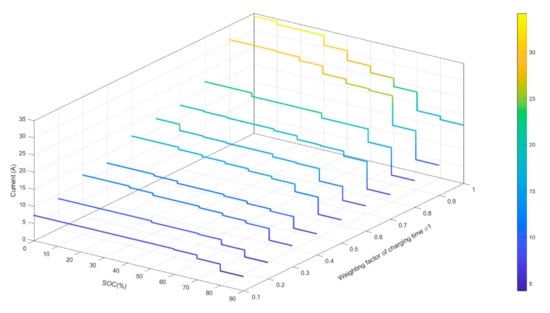 Figure 9 shows the charging current curves of from 0.1 to 1, respectively. It can be seen that the larger the weight factor of charging time, the larger the charging current is in each stage, especially in the stage with lower SOC, because higher means higher requirements for charging time and the charging strategy will focus on reducing the charging time, and vice versa. To further analyze the performance of temperature increase and uncharged capacity, we choose the cases of = 0.1, 0.5 and 0.9 for detailed study. Figure 8b shows the charging current curves of these three conditions, corresponding to Figure 9, which can provide reference for temperature increase and SOC change. Figure 8c shows the change of SOC during charging. When is increased, more weight is given to the uncharged capacity, so the final SOC is also increased. It should be noted that as is increased, SOC does not increase all the time since it has reached the preset value. Figure 8d shows the change of the battery temperature with the charging time. It can be seen that the temperature increase increases when increases. The reason for this is that charging time is shortened by increasing the charging current, and the large current corresponds to a higher temperature increase. When the current gradually decreases with increasing SOC, the battery temperature also decreases, closer to the ambient temperature, because the rate of heat generation of the battery is less than the rate of heat dissipation.
