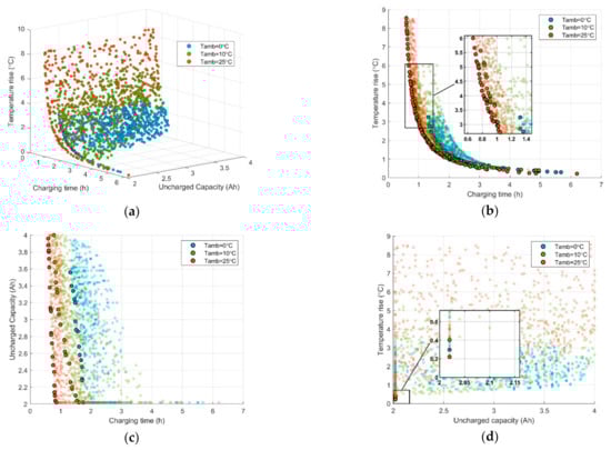 Based on the parameters decided previously, this section will discuss the influence of different ambient temperatures on charging performance. The ambient temperature was set as = 0 °C, 10 °C and 25 °C, respectively. According to the constraints, the maximum charging current at each ambient temperature is = 0.8 C, 1.5 C and 2 C, respectively. Figure 10a presents the simulation results at different ambient temperatures. It can be seen that the distribution of Pareto solution at different temperatures is quite different. Higher ambient temperature leads to a higher overall temperature increase distribution. Figure 10b clearly shows the relationship between temperature increase and time. Higher ambient temperature will allow greater maximum charging current, resulting in a higher temperature increase. However, at the same charging time, the temperature increase in the low temperature environment is higher, because the internal resistance of the battery becomes larger at low temperature, so that the same current will generate more heat. In Figure 10c, the higher the ambient temperature is, the closer the Pareto solution set is to the origin, and the same uncharged capacity corresponds to shorter charging time. The overall analysis shows that higher temperature can achieve a better optimization in the three optimization objectives, but the temperature should be limited in the safe range.