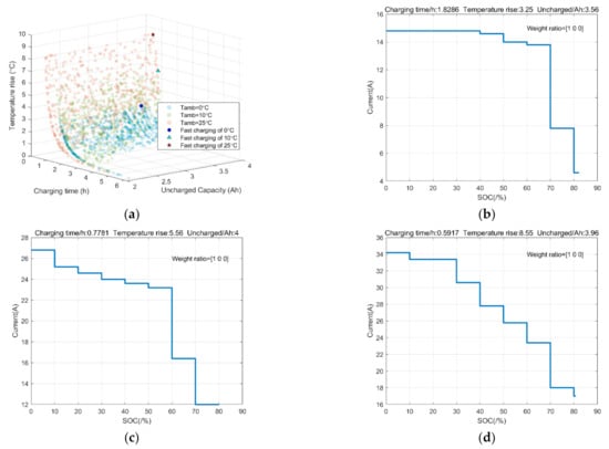 Simulation results of different charging stages. (a) Pareto solution of charging time, uncharged capacity and temperature increase; (b) Pareto solution set of charging time and temperature increase; (c) Pareto solution set of charging time and uncharged capacity; (d) Pareto solution set of uncharged capacity and temperature increase.