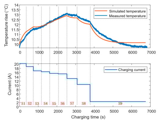 It can be seen from Figure 13 and Figure 14 that in the S1–S6 stage, when SOC is low, the charging current is large, so the initial temperature of battery temperature increases rapidly. Then, in S7–S9 stage, the current decreases and the heat dissipation rate is greater than the heat generation rate, so the battery temperature gradually decreases. The temperature error between simulation and experimental measurement is less than 1 °C and the maximum temperature increase error is less than 0.5 °C in the charging process, and the simulation curve can follow the actual temperature trend. For the normal charging in Figure 13, the uncharged capacity is 2 Ah, which is consistent with the simulation results. The charging time (6836 s) is only 1.3% longer than the simulation time (6743 s). In Figure 14, the uncharged capacity of fast charging is 3.5 Ah, which is 0.5 Ah less than the simulation results. This is because the actual charging process reaches the cut-off voltage in stage 9, later than the simulation due to the parameter estimation error. The charging time is 2963 s, which is only 5.7% more than the result in simulation (2803 s). Therefore, the experimental results show that the simulation results can accurately predict and follow the actual performance of three optimization objectives, and further verify the feasibility and effectiveness of the proposed strategy.