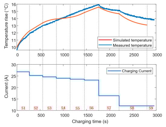 Based on Equation (13), the temperature increase at time k during the charging process is given by