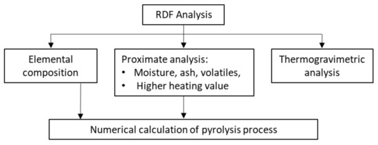 The flow chart of the study and methodology is presented in Figure 1. The results from the proximate and ultimate analyses of refuse derived fuels were used as input data for the numerical calculation of the pyrolysis gas composition. Thermogravimetric analysis was selected as the representative method for a set of pyrolysis process parameters.