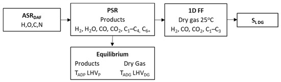 Numerical modelling workflow. Dry ash free (DAF), perfectly stirred reactor (PSR), 1D FreeFlame model (1D FF), laminar flame speed (SL DG), lower heating value of the dry gas (LHVDG), and raw pyrolysis products (LHVP).