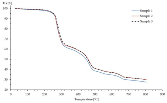 - around 70% of the mass of the tested samples underwent thermal decomposition mainly in three stages at temperatures ranges of about 280, 470, and 670 °C;