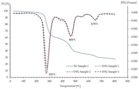 As can be seen in Figure 4 and Figure 5, the results of the pyrolysis process for the repetitions are comparable. The results show that a significant part of the material underwent a thermal degradation in the temperature range of up to 480 °C (Sample 1—65 wt% and Samples 2 and 3—63 wt%). The next important weight loss (about 11 wt%) occurred in the temperature range of up to 670 °C. After the end of the pyrolysis process, at the temperature of 800 °C, the residues of the charge material were at levels of approximately 28 wt% (Sample 1) and 29 wt% (Sample 2 and 3).