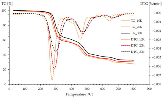 The obtained TG and DTG curves for the analyzed samples are almost identical, which proves the homogeneity of the investigated samples. Therefore, the influence of the heating rate on the pyrolysis process was studied only for sample 1. The analysis was carried out for three heating rate levels (10, 20, and 30 °C/min) and the results in the form of the TG and DTG curves are presented in Figure 6.