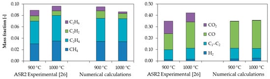 A comparison of the numerical and experimental results for ASR 2 was prepared and is shown in Figure 7. A general underestimation of the CO2 production was recorded, while the CO shares were overestimated. A similar effect was observed for the pyrolysis of a biomass-based waste, with CRECK by Rajca et al. [25]; however, a significantly greater share of CO2 was formed, compared to the ASR 2 results. The overall CO-CO2 mass yield corresponded with the analogous values for the experimental outcome, as well as the C1–C2 fraction contribution. The calculations indicated slightly higher rates for the hydrogen and ethylene formation compared with the test results. The total gaseous product shares for ASR 2 did not exceed 34.1 wt%, while the experiment showed their maximum at 1000 °C—43.1%.