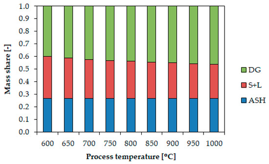 The composition of the overall pyrolysis process products was divided into five groups: H2O, H2, CO-CO2, C1–C4, and C6+ and others. We assumed that the dry pyrolytic gas (DG) consisted of elements characterized by a condensation temperature below 25 °C. Therefore, the highest density yield C6+ was rejected from the resulting product gas, as well as the remaining H2O water vapor, in order to obtain the proper dry gas composition.