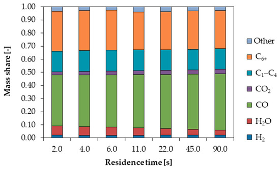 The influence of the different residence times from 2 to 90 s was investigated for the pyrolysis process temperature of 800 °C. There was a significant rise in the CO (38.9% to 42.9%) and CO2 (2.3% to 3.5%) shares for the longest time considered (90 s). The C6H6 contribution lowered with the extension of the reaction time—from 14.1% to 10.7%, while the PAH share rose. A summary amount of light hydrocarbons was constant and at about 15.8%, although distribution of the key C1–C4 types changed over the time. The methane formation was intensified—the share increased from 7.1% up to 10.8%, while the ethylene fraction dropped from 5.1% to 3%. Additionally, traces of acetylene and ethane were present, as well as ammonia and hydrogen cyanide (less than 1%). The residence time impact on the gas composition was rearranged and is shown in Figure 9.