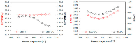 The raw pyrolysis product was processed to determine the dry gas composition, which consisted of H2, CO, CO2, and C1–C3. The evaluation of the pyrolytic gas combustible properties was carried out with LHV and TAD as the main indicators for both cases—the raw product (P) and the resulting dry gas (DG). The laminar flame speed (SL) characteristic of the dry gas was settled and is shown in Figure 10.