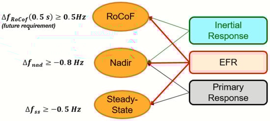 The last constraint on the post-fault frequency conditions refers to the quasi-steady state. It can be noted that its mathematical formulation in Equation (17) does not depend on the committed inertial response, whereas it only depends on the total amount of EFR and PR, regardless of their dynamic provisions. In accordance with Figure 1, represents the quasi-steady-state frequency deviation [Hz].