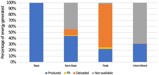 In this case study, almost all the VRES generation is fully used (low curtailment), and the demand is still largely met by conventional generators (i.e., nuclear, gas, and biomass). Note that the average load factor of VRES, due to their intermittency, is about 30% in 2050. Figure 2 shows the generation breakdown in 2050 for this scenario. Figure 3 shows that, for this scenario, the base units are at full production, while only 40% of the total available energy production is used for the semi-base units. Furthermore, the peak units are mainly deloaded, which means that the plants are reduced from their nominal operating power to a lower power level. This is explained by the fact that interconnectors and storage are always available but less needed.