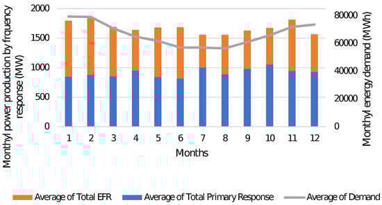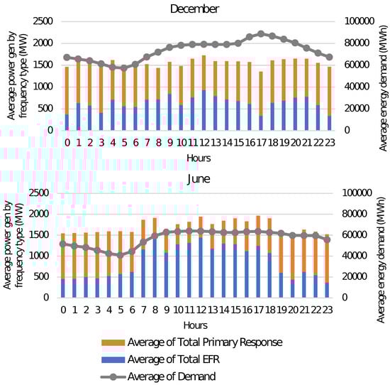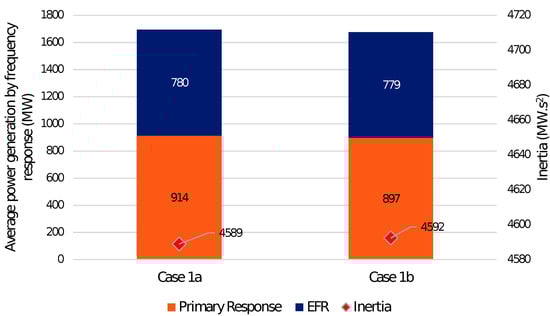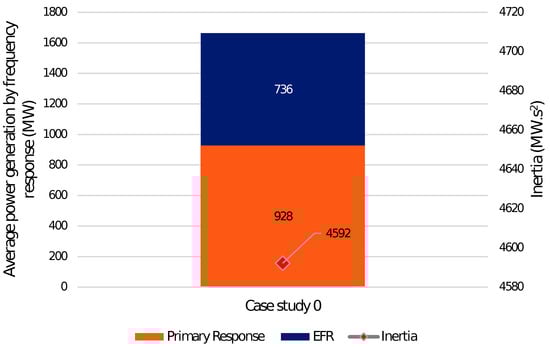 Figure 4 presents the average hourly frequency response requirement and the inertia of the system for Case study 0. The response is lower than the largest infeed loss (1800 MW), showing that the RoCoF and nadir constraints are easily respected with generation mix investigated. Only the steady-state constraint is binding, with the system being stable and exhibiting sufficient inertia.