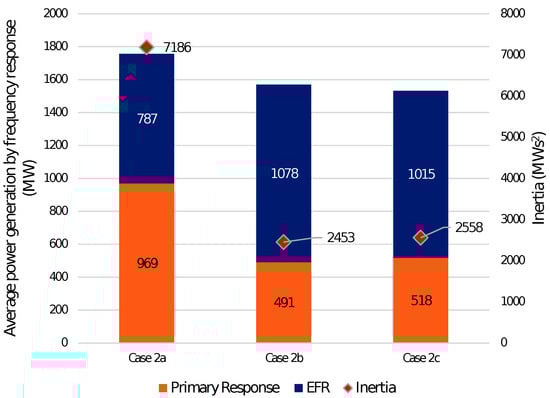 In Case study 2, whereby gas plants were replaced by nuclear plants or offshore wind farms, the CO2 emissions reduce drastically: from 21 Mt in Case 0 and Cases 1 to 25 kt in case 2a and 422/426 kt in Cases 2b/2c (see Figure 14). When semi-base gas units are replaced by nuclear plants, the system once again meets the post-fault constraints and has sufficient inertia. A higher de-loading is observed in this case mainly due to the large amount of nuclear capacity that is not needed to meet the demand. When VRES is used to replace gas, the system inertia is significantly reduced (by more than 40%). The nadir constraint becomes then a binding one and the optimisation model sees the value of providing quickly EFR rather than PR. In addition to keeping the nuclear plants online and taking advantage of their inertia, the model is sensitive to the nuclear MSF. The higher the MSF is, the less flexible nuclear power plants are, which leads to more shutdowns. In this situation EFR, with its fast response, takes on the role of nuclear inertia, therefore reducing the primary reserve to a large extent. The potential increase of EFR in the future will lead to a decrease of PR and thereby reduce the requirement of flexibility from nuclear plants. Note that, in this generation mix, with CCGT being replaced by VRES, then, during low wind events the system is easily imbalanced (with around 6% of the annual demand is not met), and more generation capacity must be added. To tackle this imbalance issue, an increase in installed nuclear capacity would be beneficial for the system but would also change the overall inertia and possibly the binding constraint. Therefore, it is suggested that, in future work, an energy mix which finds a near optimal technology deployment based on high VRES and sufficient nuclear capacity, to find a scenario that simultaneously achieves low CO2 emissions, as well as acceptable post-fault system-level behaviour.