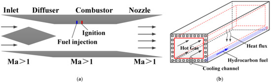 - Wang, X.; Zhong, F.Q.; Gu, H.B.; Zhang, X.Y. Numerical study of combustion and convective heat transfer of a Mach 2.5 supersonic combustor. Appl. Therm. Eng. 2015, 89, 883–896. [Google Scholar] [CrossRef]