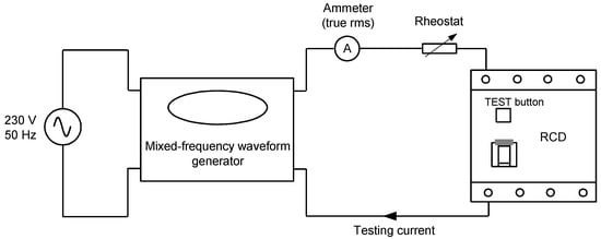 The behavior of RCDs (AC-type, A-type, B-type, and F-type) has been verified in the laboratory using a laboratory stand. Its generalized diagram is presented in Figure 7. The laboratory stand is comprised of: