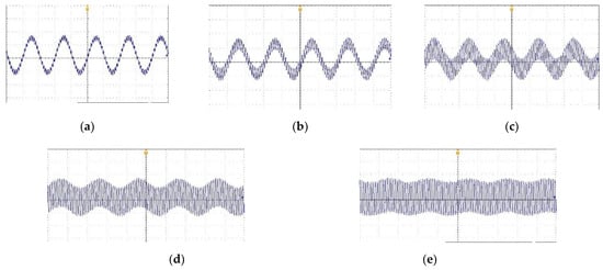 Figure 8. Example waveforms (time: 10 ms/div) composed of two frequencies, generated by the laboratory generator: (a) 50 Hz (90%) and 1000 Hz (10%); (b) 50 Hz (75%) and 1000 Hz (25%); (c) 50 Hz (50%) and 1000 Hz (50%); (d) 50 Hz (25%) and 1000 Hz (75%); (e) 50 Hz (10%) and 1000 Hz (90%).