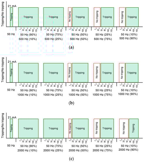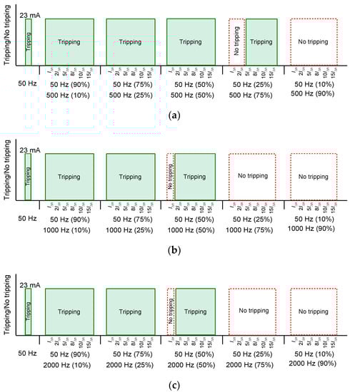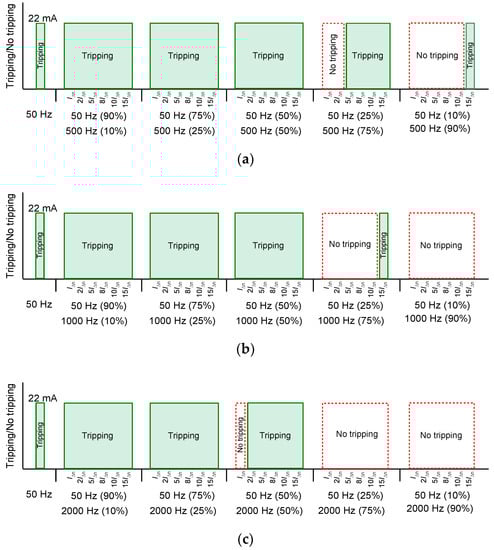 When comparing results for the AC-type RCD (Figure 9) and the A-type RCD (Figure 10) one can say that their behavior (AC-type vs. A-type) is similar. Tripping of these RCDs is possible for relatively low content of the high-frequency component (10% and 25%). In such cases, the analyzed two RCDs (AC-type and A-type) tripped even for the testing current equal to IΔn (30 mA), regardless of the aforementioned share of the high-frequency component. The content of the high-frequency component equal to 50% made the problem for the AC-type RCD (Figure 9c) when the frequency was 2000 Hz. There was no tripping for the testing current equal to IΔn.