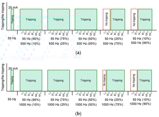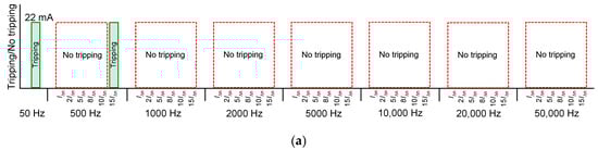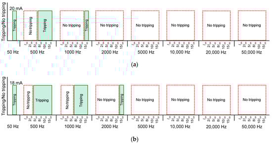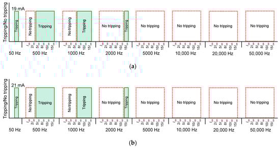 Figure 16. Tripping of the 30 mA B-type RCDs for a sine waveform of the specified frequency from 50 Hz to 50 kHz: (a) RCD_1B; (b) RCD_2B; symbols defined in Table 2.