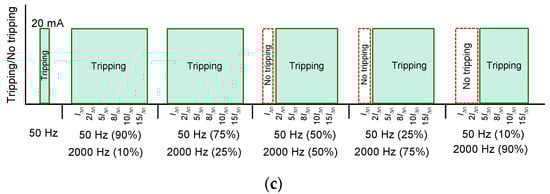 Figure 11. Tripping of the 30 mA F-type RCD (no. RCD_1F—symbol defined in Table 2) for waveform composed of the fundamental frequency (50 Hz) and high-frequency component: (a) 500 Hz; (b) 1000 Hz; (c) 2000 Hz. Values in brackets indicate the content of the particular component; 20 mA—real tripping current for a pure sinusoidal signal of 50 Hz.