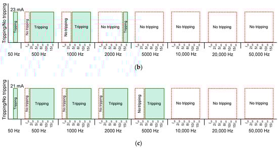 Figure 13. Tripping of the 30 mA AC-type RCDs for a sine waveform of the specified frequency from 50 Hz to 50 kHz: (a) RCD_1AC; (b) RCD_2AC; (c) RCD_3AC; symbols defined in Table 2.
