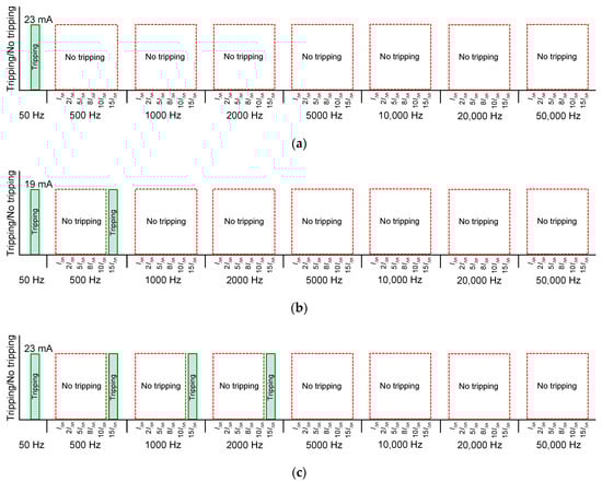 Figure 14. Tripping of the 30 mA A-type RCDs for a sine waveform of the specified frequency from 50 Hz to 50 kHz: (a) RCD_1A; (b) RCD_2A; (c) RCD_3A; symbols defined in Table 2.