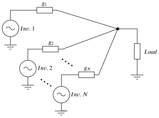 To formalize the previous discussion, consider that the N inverters controlled by the VOC technique shown in Figure 1 are synchronized. Using the fact that these oscillators are incrementally passive, it can be inferred that all states between oscillators are equal in steady state. In this condition, the microgrid can be represented as shown in Figure 3. An equivalent circuit for a single inverter that is mathematically equivalent to the one in Figure 3 is shown in Figure 4.