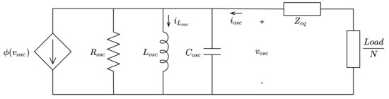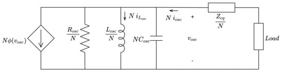 In the previous analysis, was considered to be zero. However, this condition is not realistic, as the main objective of the inverter is to supply power to the grid. To partially circumvent this issue, it is possible to imagine that a load connected to the oscillator is actually part of it, changing the values of the internal impedances. In the special case where the load is a pure resistance, , the resulting equivalent resistance, , of the new oscillator would be the computed from the parallel connection between and . This means that regardless of the value of , the new value of the resistance of the oscillator would be less than the original value. Therefore, the load seen by the inverter when connected to the network has a direct impact on the oscillation condition of Equation (19). For a given value of , it is possible for the system to become asymptotically stable when connected to a load with a sufficiently small resistance value as pointed out in Equation (8). This will be associated with the maximum allowed active power output, or rated power. Furthermore, as already discussed, has an impact on the steady state amplitude, a, and must be used to define the minimum oscillation amplitude. Similarly, looking at Equation (17), inductive and capacitive loads will directly impact the ultimate system’s oscillation frequency.