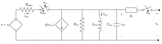 The concept of the VOC method is to emulate the dynamics of an oscillator through a power inverter. In the case of cooperation to feed the same load, this oscillator must have the property of naturally synchronizing with a unknown but finite number of several other power oscillators, that is, by construction the output voltages of all oscillators converge to the same quasi-sinusoidal oscillatory pattern, with low harmonic distortion, as a natural result of being connected to the same microgrid [17]. One of the possible oscillatory systems capable of presenting this property is shown in Figure 2, consisting of a filter and a current source controlled by a nonlinear voltage function, . The dynamic equations of this circuit are integrated by an appropriate numerical method, implemented in a DSP, which generates the voltage reference, , in that case equal to . This means that the components shown in Figure 2 are virtual ones, the reason why this method has been called Virtual Oscillator Control.