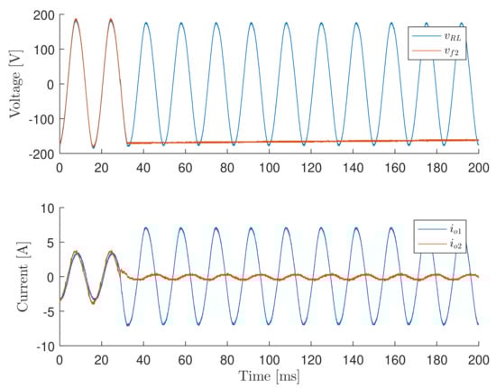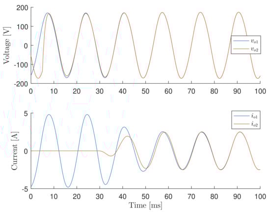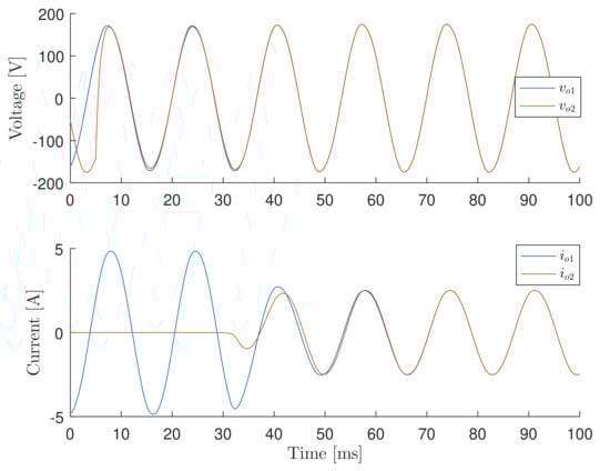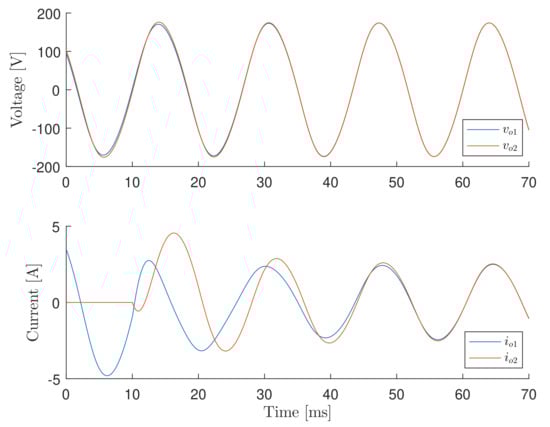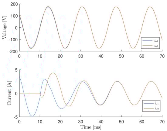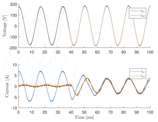 Figure 15 shows the moment when the second inverter is connected to the microgrid. The measured voltages are and , as well as currents and (see Figure 12).