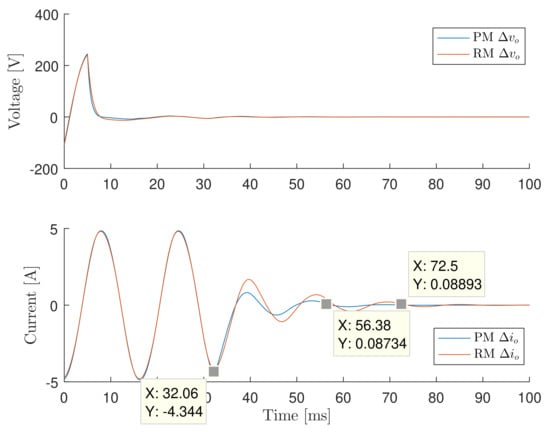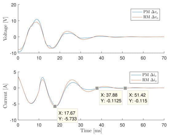 From Figure 11 it is possible to measure the settling time when the pre-synchronization is applied. In this case, this value will give an overview of the pre-synchronization and synchronization efficacy related with the VOC method applied. As in the previous case, the synchronization process for the PM is faster than in the RM. The values are for PM and for RM. For a quick comparison, Table 8 was constructed with the most important results presented in this section.