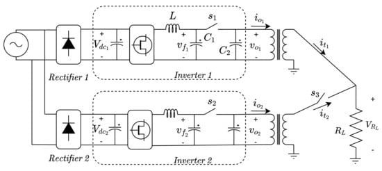 The measured voltages are and . Once requested to disconnect, the inverter goes to a state where the PWM is deactivated, so the filter voltage after this event will tend to zero. The capacitor discharge, compared to the network frequency, is slow. This ends up generating the “continuous” signal seen in the graph of Figure 16. Another point to be highlighted is the reduction of the voltage in the load after the Inverter 2 is interrupted. This reduction is due to both the increase in losses in Inverter 1 and transformer and the reduction in the reference voltage generated by the virtual oscillator. Although the values of and were chosen symmetrically in relation to , this is not mandatory. The only restriction is that . In this way the value of can be chosen to compensate for possible losses in the inverter filter, if this is relevant in a specific application.