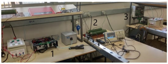Picture of the inverter assembly for testing the VOC algorithm: (1) Inverter nº. 1, (2) Set of resistive loads, and (3) Inverter nº. 2.