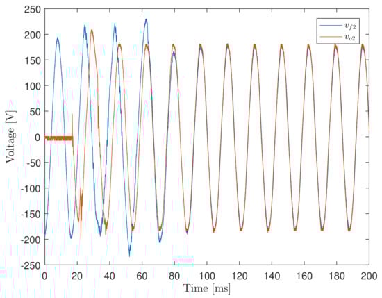 The first results are shown in Figure 14. This is related to pre-synchronization process of Inverter 2. As it can be seen, after a small transient the voltage in the inverter filter, , which is an image of VOC output voltage, replicates , except for a small lag. As will be seen below, this procedure ensures that the input transients of the inverters are well controlled.