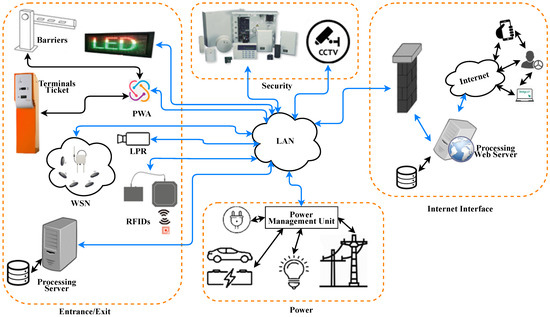 - Internet users management interface system: Drivers can follow the parking status remotely via a web page or through a dedicated application on their smartphones. Parking subscribed users will also have payment, reservation, and guidance features, etc. This part ensures the development of these interfaces. Here, the PWS collects and processes users’ data to decide and indicate its access status to PS.