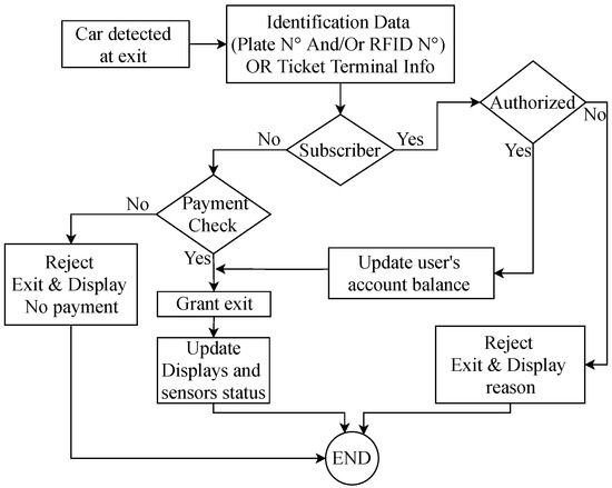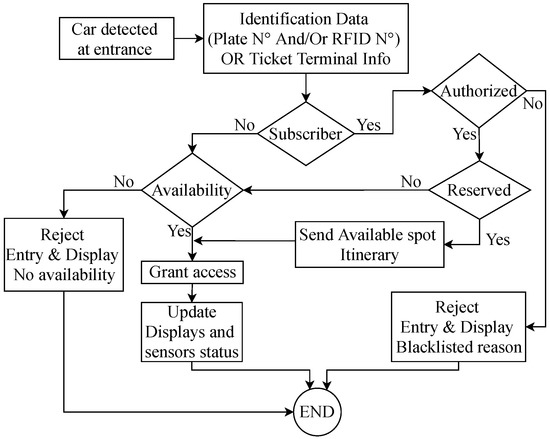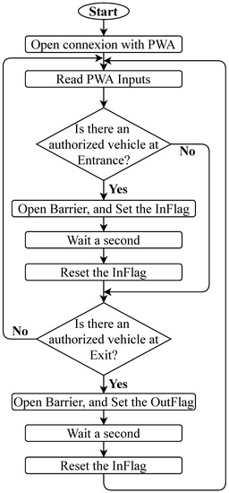 - Parking entrance/exit system: This module includes identification equipment (radio frequency identification (RFID), license plate recognition (LPR) and ticket terminals), access barriers, parking wireless sensors network (WSN), displays for signaling, and indoor guidance. Our demonstrator is a garage parking and its accesses are controlled by physical barriers. The parking web automate (PWA) module controls these barriers and also serves to detect the vehicles’ presence at the parking entrance and exit. It’s equivalent to a programmable logic controller with an embedded web server. The PWA has some digital inputs (DI) and digital outputs (DO). It will act as an actuator. The DIs are used to connect cameras DO, barrier photocell protection relays, etc. The DOs are useful to command Barriers’ opening. To monitor the parking occupancy a set of IoT sensors form the parking WSN. For identification, it worth noting that it is possible to identify either drivers or vehicles. Vehicles identification is done through plate numbers and RFID tags stuck to the car windshield. Subscribed drivers can be identified through a personal card managed by the terminal ticket board. For a visitor driver, he can get access to the parking only through the ticket terminal by withdrawing a ticket. RFID only allows subscribed users identification. The LPR can identify both (visitors and subscribers). Indeed, the license plate is one of the identifiers available on all vehicles. To retrieve these identifiers, specific cameras equipped with optical character recognition technology are used. The car park may have two: one at its entrance and another at its exit. The data are available at the equipment level and are collected and processed by PS, then transmitted to PWS.