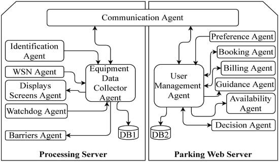 - The agent-based software architecture of our smart parking is also introduced using the concept of agents. This architecture is based on a structure with two processing servers. This structure allows modular development depending on the agents involved and allows a Processing Web Server (PWS) development independently of the equipment present in the car park, in particular thanks to the communication agent.