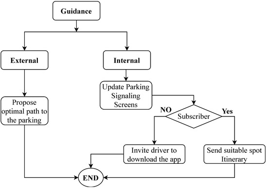 - Guidance agent: For subscribed users, they can be assisted to the parking and/or to a vacant spot through their phone application. This guidance is handled by this agent. Two types of guidance can be proposed: external and internal. For external guidance, drivers are guided to the most optimal parking lot according to its preferences while internal guidance intervenes once the driver is in the car park and guides him to the most suitable parking spot. As we have proved in a previous work [49], internal guidance can contribute to improving parking sensors’ lifetime.