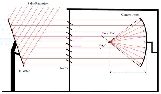 Typical configuration of a high-flux solar furnace, showing its main components: The heliostat, the shutter, and the concentrator (α is the rim angle; L is the focal length i.e., the distance between the center of the parabolic concentrator and the theoretical focal point).