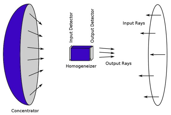 General modelling layout used in this work: Random parallel rays generated in a circle equivalent to the projected concentrator, are reflected by the concentrator to the focal zone, where they are successively reflected inside the homogenizer. The whole experiment is monitored by detectors positioned immediately before and after the homogenizer.