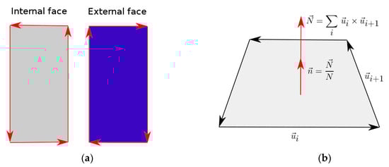 (a) Counter-clockwise oriented face (left): Inside, reflective surface. Clockwise oriented face (right): Outside, non-reflective surface. Every flat convex polygon has two faces, which can be distinguished by the orientation of the ordered vertices; (b) adding the cross vectors between successive polygon edge vectors is a simple and robust way to compute a perpendicular vector N, which can then be normalized, dividing by its length. The polygon must be flat, convex, and the vertices must be ordered.