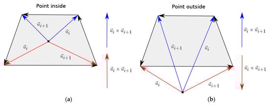 (a) Point inside the polygon: The cross product between adjacent vectors going from the intersection point to the successive polygon vertices point always in the same direction. (b) Point outside the polygon: the cross product between adjacent vectors going from the intersection point to the successive polygon vertices point in opposite directions. In both cases, the polygon must be flat, convex, and the intersection point must be in the polygon plane.