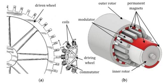 Gear transmissions are components of propulsion systems commonly used to transform parameters of mechanical energy (torque and speed) between load and drive systems. In other words, gears are applied to fit the values of the rotational speed and mechanical torque of a power source to the required values of their output parameters [1]. Nowadays, in most commonly applied mechanical gears, the power is transmitted by meshing the gear teeth. The undeniable advantages of mechanical gears are high torque density, efficiency, and ease of manufacture. However, their inherent disadvantages include high noise and vibration levels [1,2,3], friction between teeth [4], as well as a substantial maintenance cost. The use of magnetic forces for the transmission of mechanical power instead of physical contact removes at least some of the unwanted features of mechanical gears. Magnetic gears (MGs) provide contactless transmission of torque, which allows reducing vibrations and noise as well as increasing the durability [5,6,7,8], which decreases maintenance cost. Another advantage of the MG is its natural protection against overload [9]. The concept of the MG is not new. The first magnetic gear (shown in Figure 1a) was patented more than 100 years ago by Armstrong [10]. The torque transmission was achieved by using the system of electromagnets located on the driving wheel, which were supplied by mechanically commutated currents. The magnetic flux excited by the system of electromagnets was coupled to the driven wheel having non-silent magnetic poles producing reluctance torque. Despite the discussed advantages of reluctance-torque-based designs of MGs, they could not compete with mechanical gears in terms of torque density, due to the limited exploitation of the magnetic circuit and magnetic flux density, which limited the focus on MGs for many years.