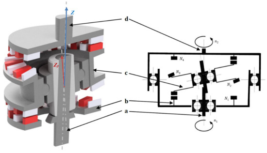 Concept and kinematic scheme of the magnetic two-stage precession gear: a, input shaft; b, immovable ring; c, intermediate ring; and d, output ring with output shaft.