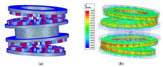 To achieve the precise distribution of the magnetic field allowing for detailed analysis of a torque transmission process, the studied domains were subdivided into more than 830,000 tetrahedral elements. The mesh was refined for magnetically active regions as magnets and air gaps. The visualization of the finite element mesh excluding the air region at the selected position of the gear elements is shown in Figure 5a, while the corresponding distribution of the magnetic field lines is depicted in Figure 5b. It can be observed that the studied magnetic circuit is not saturated since the maximum value of the magnetic flux density does not exceed 1.4 T. The increased value of the magnetic flux density can be observed in the regions of the minimum value of the air-gap lengths. It can also be noticed that in these regions, a closed loop of the magnetic flux is formed according to the magnetization direction of the magnets. This flux contributes to the transmission of torque by the gear.